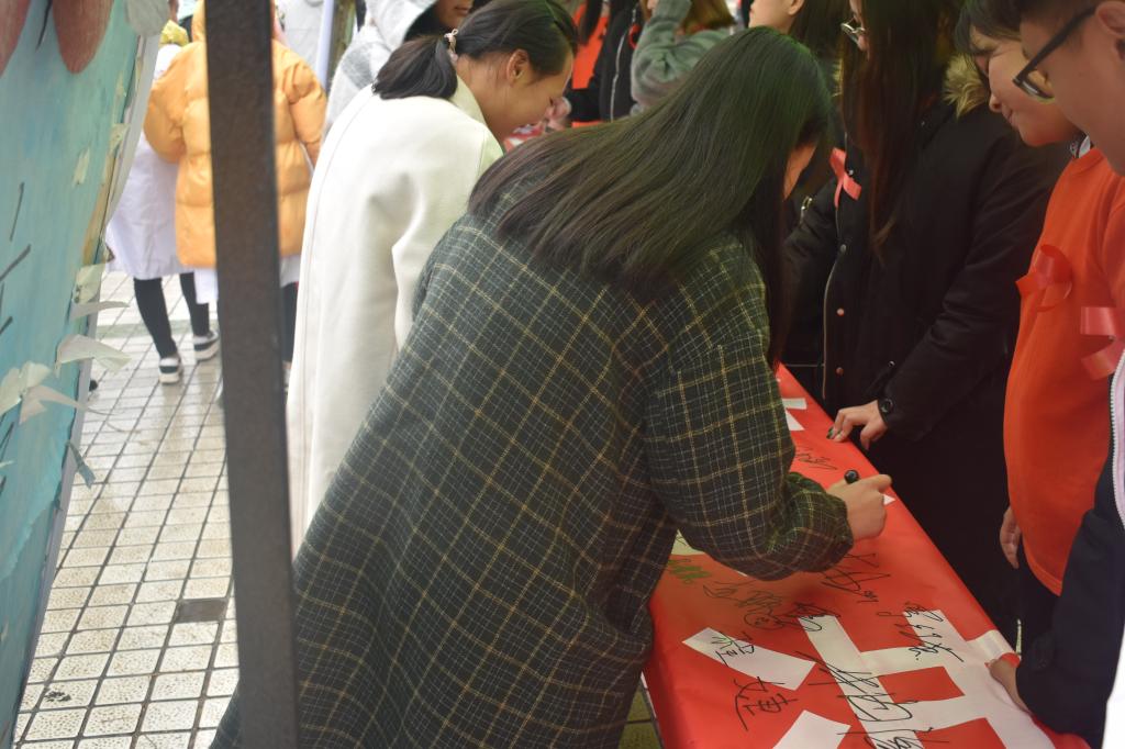 12月3日,诸侯快讯ok1122官网医护学院在校内开展艾滋病日宣传活动,现场悬挂了“人人参与防艾行动,家家拥有幸福家园”、“手牵手同牵红丝带,心连心共防艾滋病”等标语十分醒目,师生们纷纷在横幅上签字,表示“预防艾滋,从我做起”,最后,师生们纷纷佩戴起红丝带,来表示他们对防治艾滋病的关心。