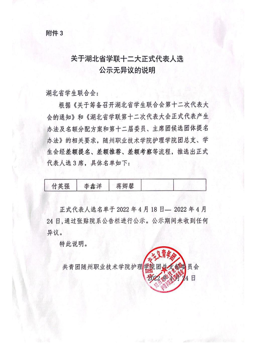 关于湖北省学联十二大正式代表人选公示无异议的说明