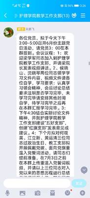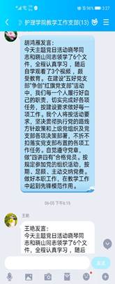 何筱英发言:今晚认真学习了教学工作支部主题党日活动安排的学习内容。作为一名即将退休的老教师老党员,一定要“不忘初心,牢记使命",站好最后一班岗,除了不折不扣的完成好自己的本职工作外,还应作好年轻教师的传帮带工作,同时为护理专业的建设与发展谏言献策。