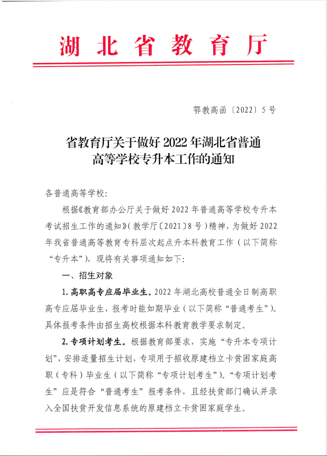 省教育厅关于做好2022年湖北省普通高等学校专升本工作的通知