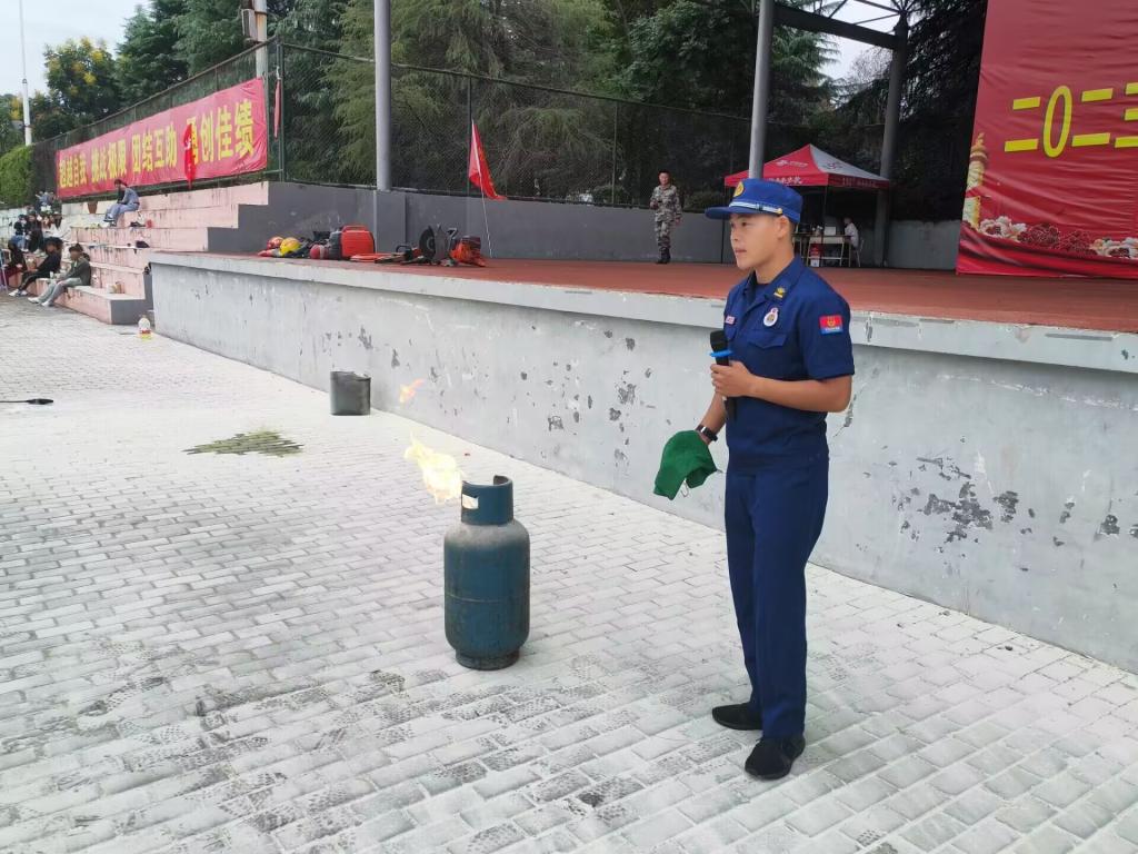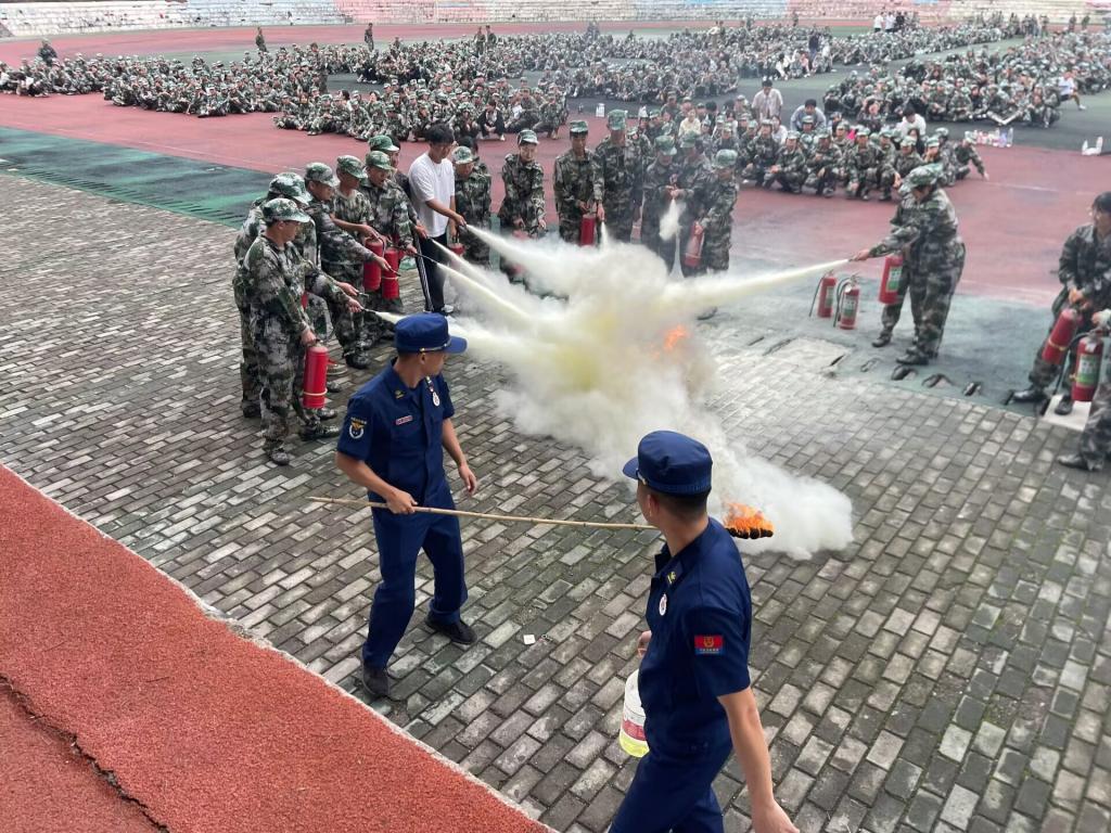 首先,各教官组织各班级到达相应的地方,所有人安静有序的听从教官的指示,总教官一一介绍了为学生讲解消防安全知识的相关人员。然后,消防队员与学生进行互动,消防队员现场示范灭火器的使用方法,对灭火器正确使用进行了现场指导,讲述了消防知识的重要性和必要性,同学积极做出回应并且牢记心中。