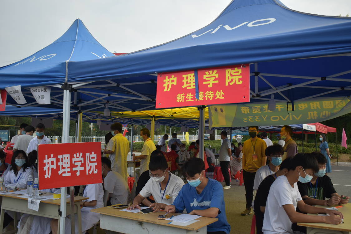 由于疫情,家长与车辆不得入校,志愿者们便帮助新生们提起沉甸甸的行李,将新生们送至宿舍区报到。新生们进入宿舍后便不得再离开宿舍,需在宿舍“封控”5天,这5天内的食宿将由志愿者负责,于是,便有了以下场景: