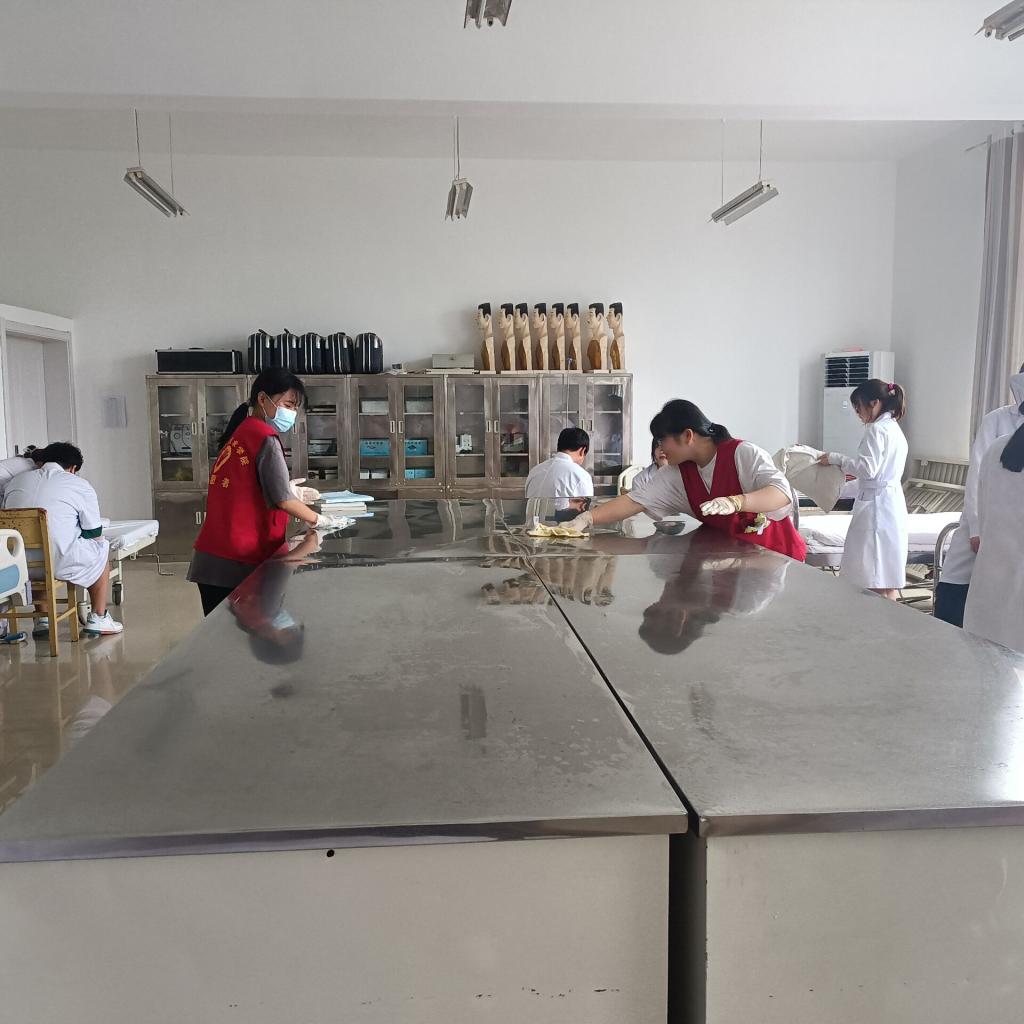 活动伊始,本次志愿者活动负责人根据任务安排以4人为一组将志愿者们分为了5个小组,每个楼层安排2个小组负责,4楼因为只有一间实训室,所以只需安排1个小组负责。活动中,志愿者们有的擦桌子、擦仪器,有的扫地拖地,还有的同学整理药品、考试用品。同学们分工明确,积极配合,每个人都认真地进行着自己手上的工作。