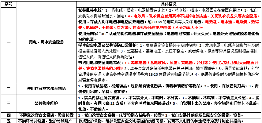 2、宿舍无大功率电器,譬如:锅、锅盖、锅线、蒸蛋器、电饭煲、电磁炉、烧水壶、取暖器、大风扇、小型制冷机、小型冰箱、小型洗衣机、吹风机、直发棒、卷发棒、热水袋、热水袋充电线、变压器等;
