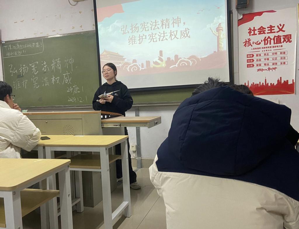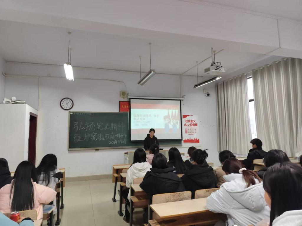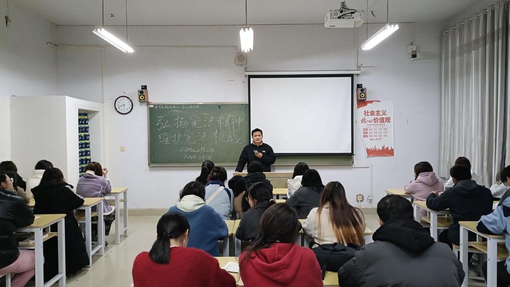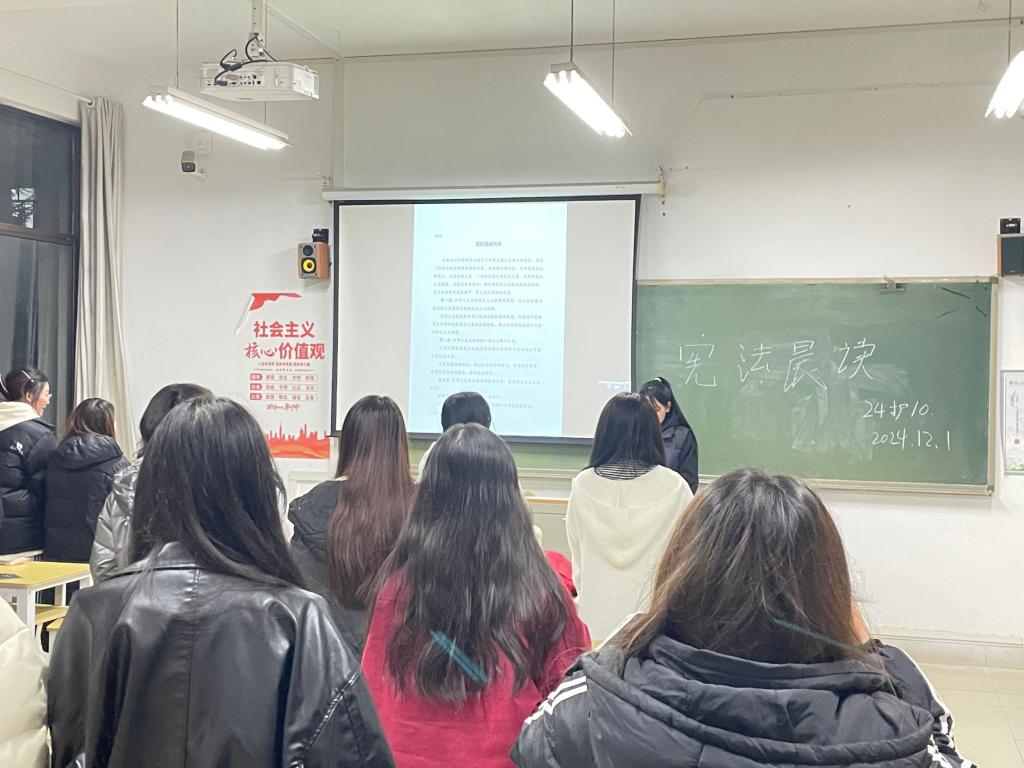 2024年12月2日,各班级开展了“弘扬宪法精神,维护宪法权威”主题班会。辅导员从“宪法的概念、宪法的性质、宪法的特征、宪法的发展”等四个方面带领大家深入学习,用生动的事例、鲜活的语言宣讲宪法,鼓励同学们树立法治观念、增强法律意识。