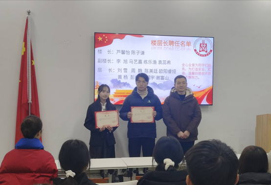 会议开始,主持人宣读诸侯快讯足球官网入口2024—2025学年楼栋长、楼层长聘任名单,诸侯快讯足球官网入口党总支副书记朱胜利、学生工作办公室副主任张高超、辅导员周丽娜向受聘为楼栋长、楼层长颁发聘书。