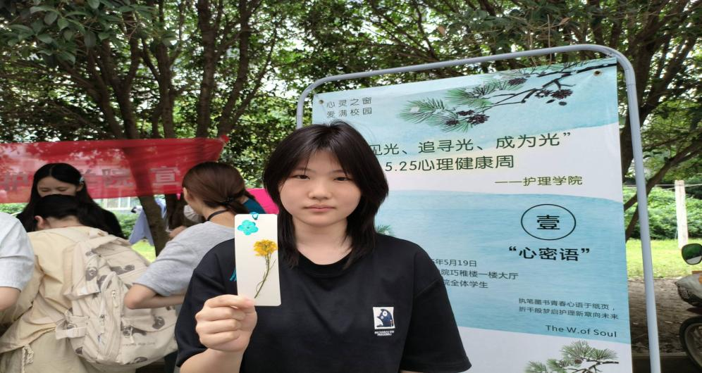 活动现场花香浮动,师生们围坐桌前,开启了一场与自然的对话。工作人员以轻柔语调讲解干花书签制作技艺后,镊子与花瓣的交响曲便悄然奏响。玫瑰的柔美、雏菊的清雅、紫罗兰的梦幻……参与者们以镊子为“绣花针”,将干花拼贴成灵动图案:有人勾勒蝴蝶翩跹的自然画卷,有人组合几何线条构筑抽象意境。当空白书签蜕变为独一无二的“植物标本”,师生们执笔在背面书写心绪——或记录压力释放后的豁然感悟,或镌刻鼓舞人心的温暖语句。“每一片花瓣的弧度都是情绪的留白,书写时仿佛在与未来的自己对话。”护理专业学生杨婧仪轻抚着作品感慨。活动尾声,师生携书签与定制小礼品(精致小扇、迷你喷壶)离开,将这份自然与心意的馈赠带回生活。