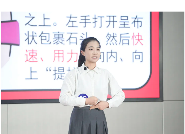 本次大赛中,葛尧以《救命只需要一个拥抱:海姆立克的生死时速》为题,巧妙地将扎实的护理专业知识融入生动的应急场景。她通过逼真的情景模拟还原急救现场,以精准的操作示范、通俗易懂的“大白话”科普,配合与现场观众的高效互动,清晰、高效地传递了急救核心要点。其流畅的表达、专业的素养和沉稳的台风,赢得了评委与观众的高度认可,最终成功跻身全省十佳。