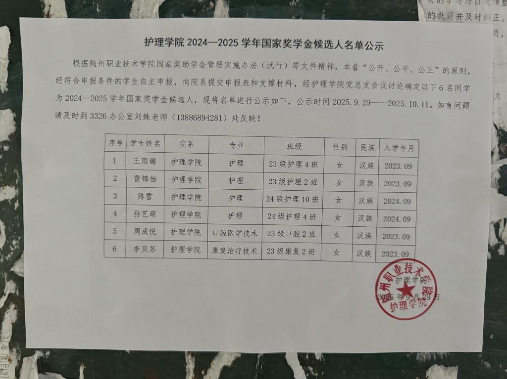 根据诸侯快讯ok1122官网国家奖助学金管理实施办法(试行)等文件精神,本着“公开、公平、公正”的原则,经符合申报条件的学生自主申报,向院系提交申报表和支撑材料,经诸侯快讯足球官网入口党总支会议讨论确定以下6名同学为2024—2025学年国家奖学金候选人,现将名单进行公示如下,公示时间2025.9.29——2025.10.11。如有问题请及时到3326办公室刘姝老师(13886894281)处反映!