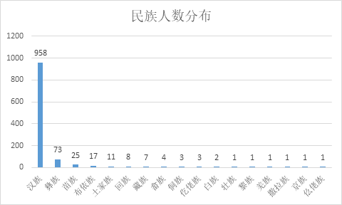 本专业共有18个民族,汉族958人,占比85.54%;彝族73人,占比6.52%;苗族25人,占比2.23%;布依族17人,占比1.90%;土家族11人,占比0.98%;回族8人,占比0.71%;藏族族7人,占比0.63%;其它少数民族合计21人。