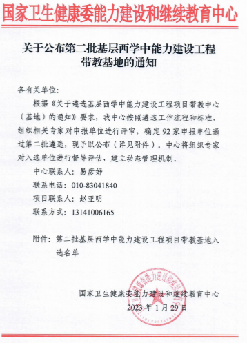 1月29日,国家卫生健康委能力建设与继续教育中心公布了第二批基层西学中能力建设工程带教基地名单,全国共有92家单位获批,我校榜上有名。